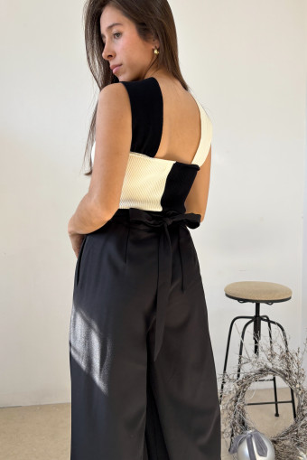 Maxi pantalón en tela ligera con piernas anchas, peto amplio con cintillo ajustable en misma tela y cierre lateral.