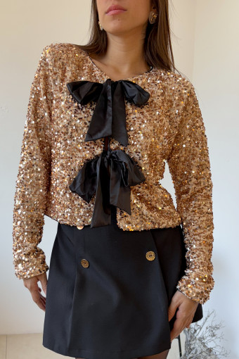 Blazer corte regular en lentejuelas con forro interior, lazos ajustables con efecto satinado y bastillas en contraste color negro.